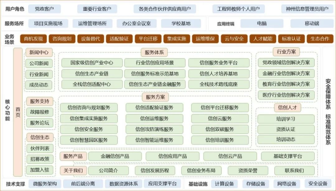神州信息致力于与打造全国领先的信创服务体系,“生态是灵魂,体系是核心,平台是载体”是神州信息信创服务体系的核心理念。信创服务业务平台是信创服务体系的重要载体,致力于支撑全国万亿信创产业,成为国家级信创服务门户平台,围绕党政领域及14个重要行业的信创全生命周期业务场景,为客户、合作伙伴、供应商、工程师提供一站式信创服务。